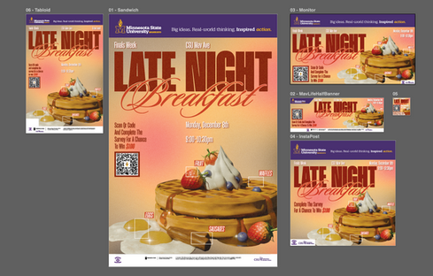 In addition to this project, I completed over 30 promotional pieces for campus-wide events, including tabloid posters, table tents, sandwich boards, Instagram posts and stories, website banners, and digital monitor slides. I also worked on special projects such as backdrops, dropdown banners, packaging, certificates, flyers, and postcards, adapting each design across multiple formats while maintaining strong visual consistency.